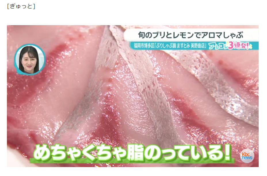 25年12月 福岡KBCテレビ「ぎゅっと」さんのアロマ鍋特集にて当店の「ぶりしゃぶレモン鍋」をご紹介いただきました。 YOUTUBEでもご覧いただけます。